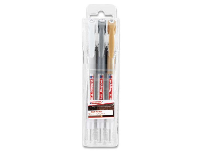 Fix popisovač Edding 2185/3B gelový roller 3ks set Gelový roller edding 2185 s inkoustem na vodní bázi využijete především pro zdobení tmavého papíru. Jeho pomocí vytvoříte osobitá přáníčka, komplimentky, jmenovky či PFka. Pogumovaný úchop zlepšuje držení rolleru. Jeho hrot...