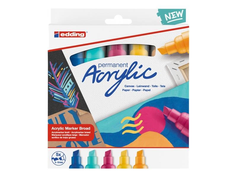 - Sada 5 akrylových popisovačů edding 5000 ve výrazných barvách pro spontánní kreativitu na světlých i tmavých površích materiálů jako je plátno, malířský papír, hladké dřevo a kámen