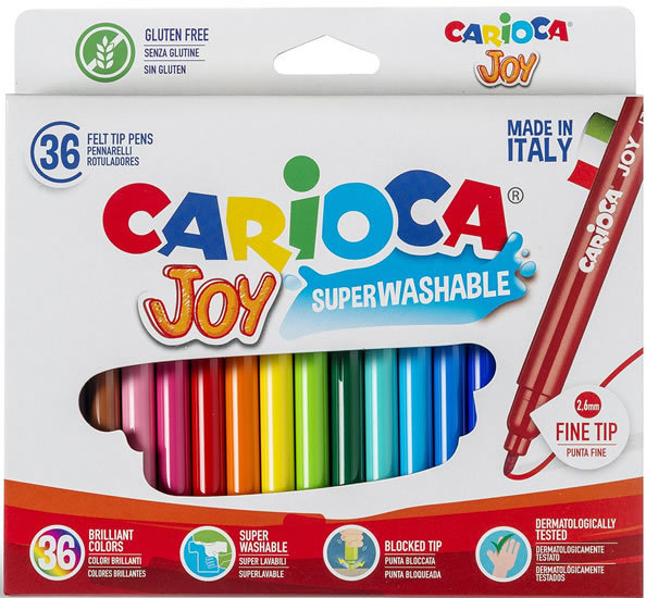 Sada fixů Carioca Joy Superwashable s hrotem šířky 2,6 m. Inkoust je snadno omyvatelný a netoxický. Z oblečení i rukou lze snadno umýt a to i pouze studenou vodou bez použití mýdla. Díky těmto vlastnostem jsou fixy vhodné pro tvoření s nejmenšími dětmi. S prečítať celé