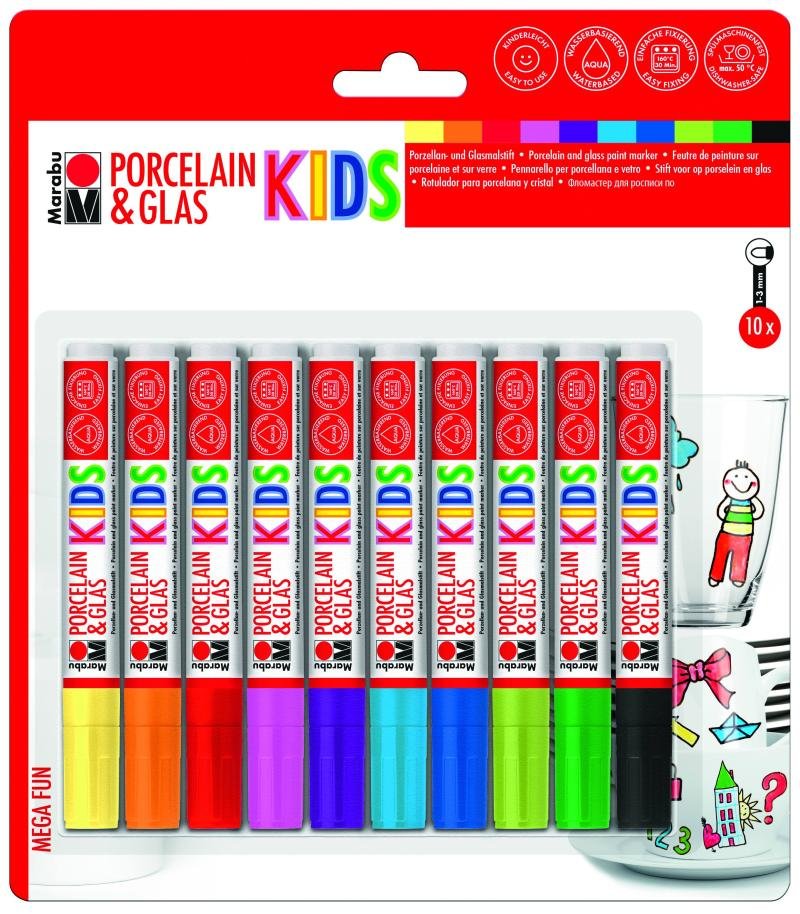 Marabu dětský popisovač na porc. a sklo/sada 10x 1-3mm. Marabu KiDS Porcelain & Glas Painter - zábava pro děti na výrobu porcelánu a skla! Nyní mohou děti od 3 let navrhovat např. Vlastní keramické a skleněné nádobí s ideální dětskou značkou „Marabu KiDS Porcelain & Glas Painter“. Od chvíle, kdy...