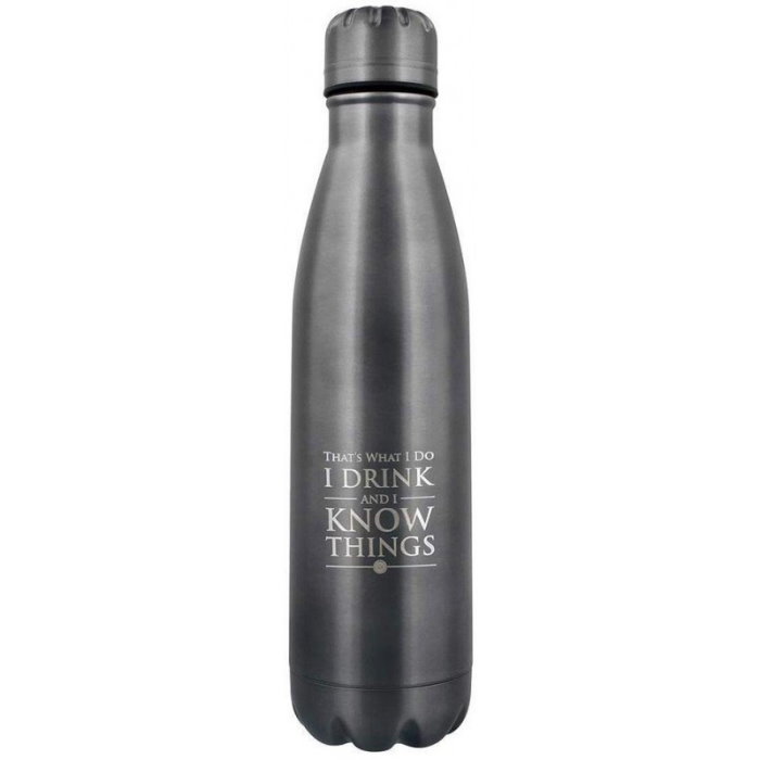 Stylová kovová láhev a termoska na cesty pro milovníky fantasy seriálu Game of Thrones - Hra o trůny s citátem Tyriona Lannistera I Drink And I Know Things - pro ty, co pijí, a vědí. prečítať celé