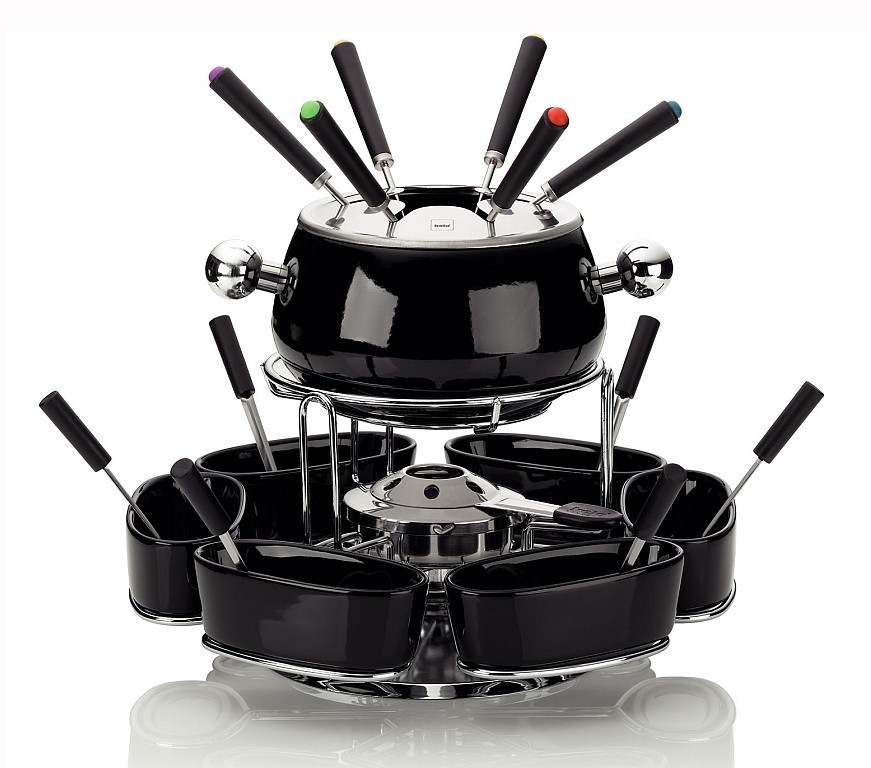 -fondue hrnec nerez - černý smalt-nerez víko-fondue hořák-chromovaný kolotoč-6 ks černých keramických misek-6 ks fondue vidlic-6 ks fondue lžiček prečítať celé