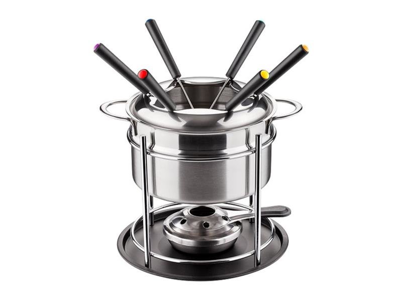 Sada obsahuje: nerezovou varnou nádobu, 6 vidliček v barevném provedení, pokličku a držák vidliček, stojan a hořák.