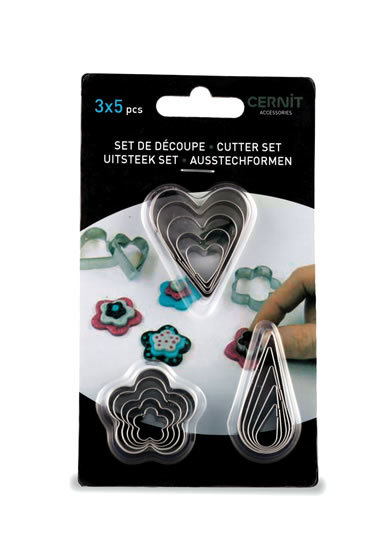Sada vykrajovátek na polymerové hmoty. V sadě je celkem 15 tvořítek: 5 vykrajovátek ve tvaru kapky o různých velikostech, 5 vykrajovátek ve tvaru srdce a 5 vykrajovátek ve tvaru květiny.