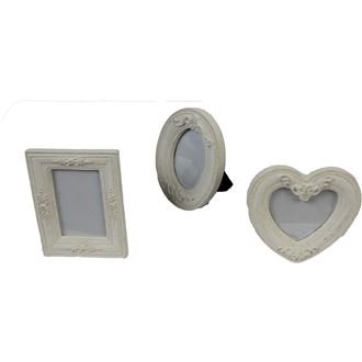 Rámečky jsou v bílé barvě. Rámečky jsou ve třech tvarech, přesně jako na fotce. Velikost rámečků je zhruba stejná, rozměry 5,5 - 7,5 cm. Srdíčko je na fotografii o rozměrech 4 x 4 cm. Ovál je na fotografii o rozměrech 3 x 4,2 cm. Obdélník je na fotografii o rozměrech 3 x 4,5 cm.