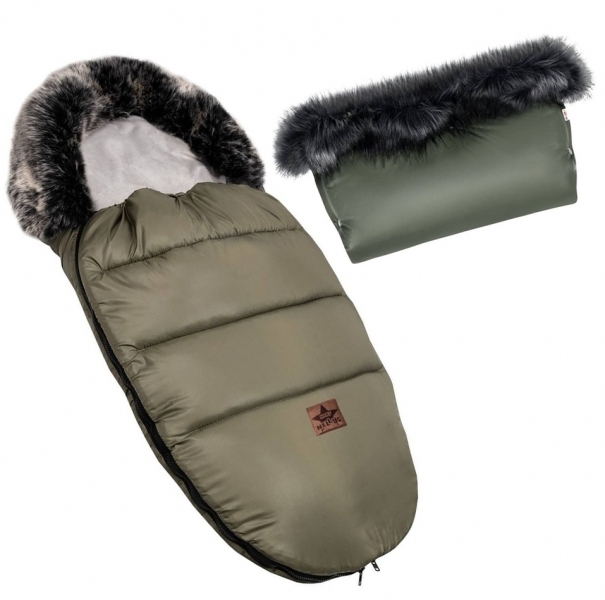 Zimní fusak s kožešinou + rukávník zdarma, Baby Nellys, 50 x 100cm, olivový