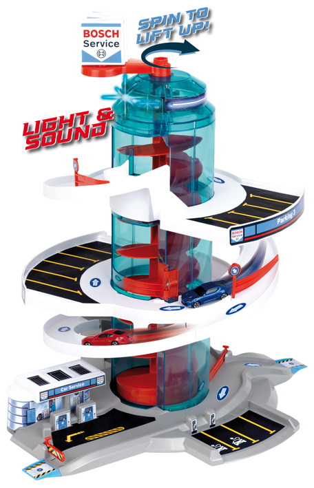 Garáž v licenci BOSCH s výtahem, který otáčí auta do různých úrovní. Garáž obsahuje světelné a zvukové efekty, 2 auta, spínače pro změnu jízdy, rampy a 4 čerpací místa. Výška garáže je 57 cm. Baterie nejsou součástí balení. Vhodné od 3 let. prečítať celé