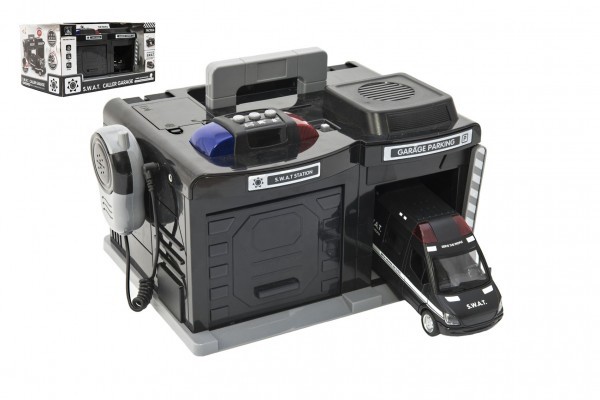 Policejní stanice s autem se stane skvělým dárkem pro každého strážce zákona. Stanice vydává zvukové a světelné efekty, součástí je funkční mikrofon, otevírací vrata a rukojeť pro snadnější přenášení. Policejní automobil svítí a houká. Garáž je na baterie 3x AA 1,5V, auto je na baterie 3x AG13. Baterie nejsou součástí balení.