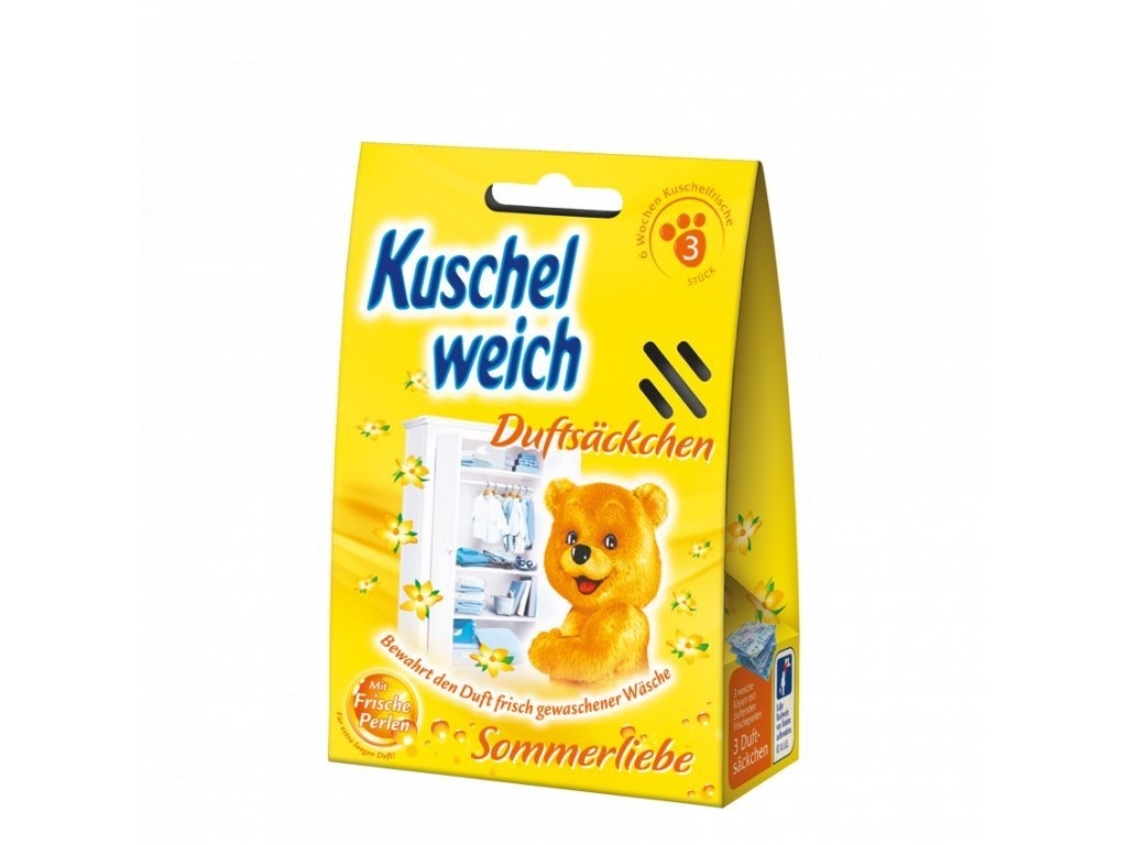 Kuschelweich vonné sáčky do šatníku - vůně Sommerliebe - letní láska. Tři měkké polštářky s vonnými svěžími perlami přinášejí do Vašeho šatníku letní vůni na dlouhých šest týdnů. POUŽITÍ: Kuschelweich vonný sáček položte nebo zavěste na ramínko. Sáček má pro snadné zavěšení na ramínko vytvořený...