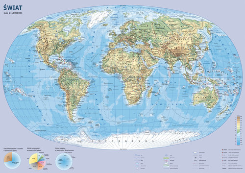 Świat - mapa ścienna w skali 1 : 60 000 000 - fizyczno-polityczna. Przejrzystemu obrazowi ukształtowania lądów i oceanów towarzyszą takie elementy treści jak: główna sieć rzeczna i najważniejsze jeziora, opisy ważniejszych krain geograficznych, wysp, półwyspów, mórz, basenów i grzbietów...