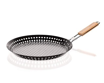 Grilovací pánev 31 x 3,5cm je ideální ke grilování ryb, masa a zeleniny. Je vyrobena z ušlechtilé oceli. Díky nepřilnavému povrchu se grilované potraviny z pánve snadno vyjímají. Praktická je sklápěcí dřevěná rukojeť s kovovým rámem a závěsným očkem. Specifická konstrukce pánve s otvory zajistí rovnoměrné grilovaní potravin a pomohou rozvinout vůně typické pro grilování.