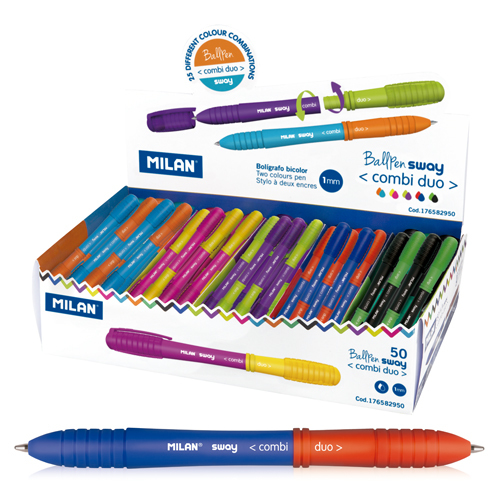 Pero guľôčkové MILAN SWAY Combi Duo s dvomi ľahko vymeniteľnými špičkami vďaka svojmu rotujúcemu systému. 5 pier s dvojitým hrotom s 10 atramentovými farbami (telo rovnakej farby ako atrament). Hrot 1 mm. Rozmanité farby: žltá, modrá, svetlo modrá, fialová, oranžová, červená, ružová, zelená, svetlozelená, čierna. Dĺžka pera 137 mm x 1,7 mm.