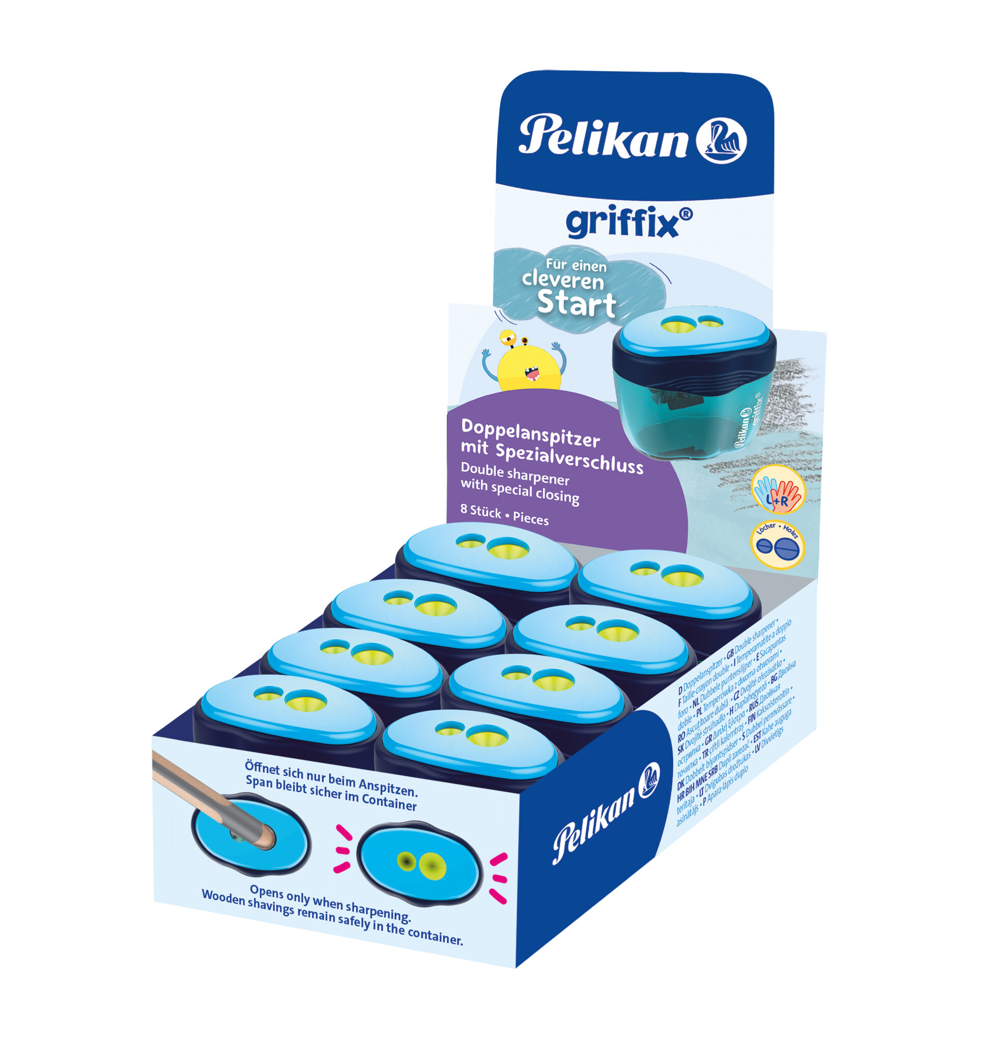s bezpečným uzávěrem otvoru pro dřevěné tužky, pastelky Griffix, kvalitní nůž, stabilně stojící, průhledná nádoba, snadné zaklapnutí, 8 kusů s EAN štítkem na displeji prečítať celé