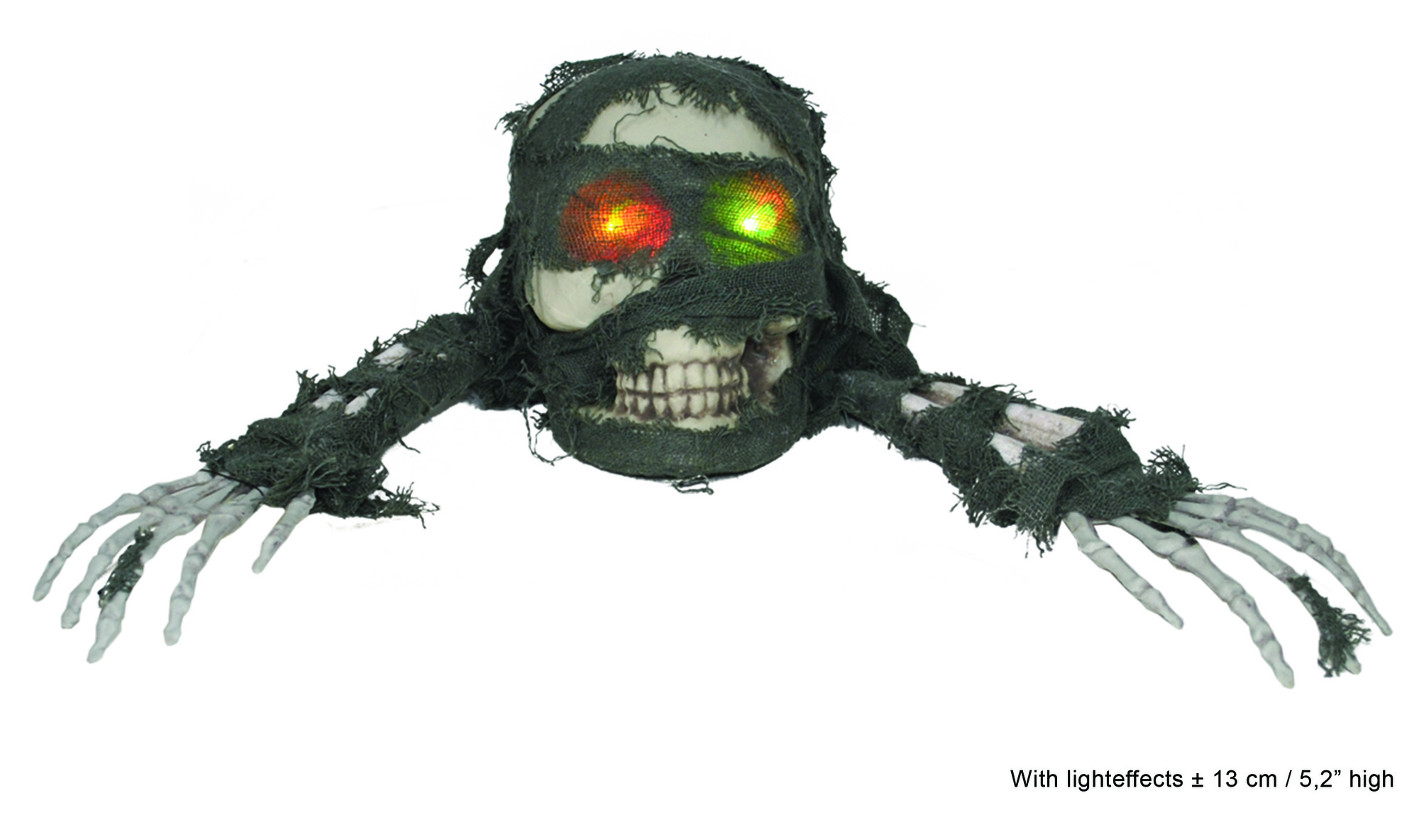 Halloweenská dekorace lebka s rukama. Vhodné jako doplněk na vytvoření správné hororové atmosféry. Kosti a lebka jsou svázány černou roztrhanou látkou. Zabudované LED v očích. Ideální dekorace na skříň, stůl či schodiště. Napájení pomocí baterií 3x knoflíková baterie LR44 (součástí balení).