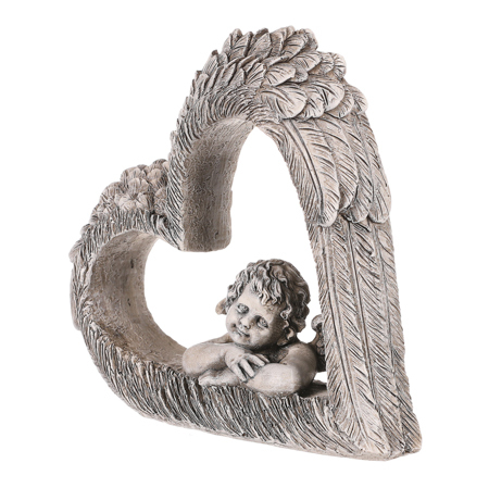 Vytvořte si významné vzpomínkové místo s naším srdcem zdobeným pírky a andělem, vyrobeným z polyresinu v šedé barvě. Toto jedinečné srdce představuje pietní dekoraci, kde anděl pozorně vyhlíží z malého okénka ve tvaru srdce. Jeho horní část je symbolicky zdobena pírky z andělských křídel, přinášejíc do prostoru dojem nebeské lehkosti. Umístěte tuto pietní dekoraci na vhodné místo jako vzpomínku a uctění památky na ty, kteří nás opustili.
