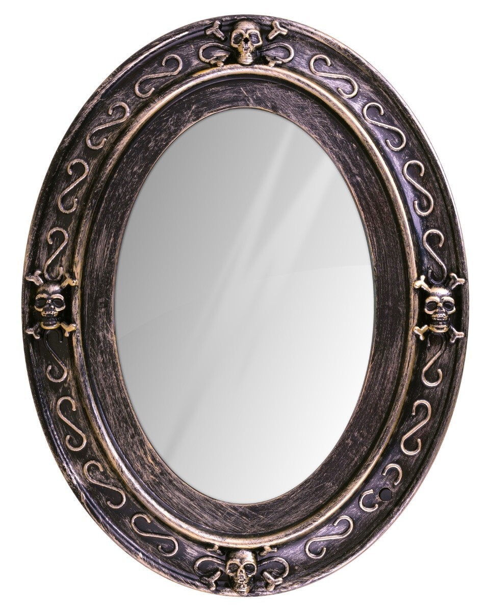 Černozlaté oválné strašidelné mluvící halloweenské zrcadlo vybavené dvojitým senzorem, který se aktivuje pohybem a zvukem. Vhodné jako rekvizita do strašidelného domu. Zrcadlo ožívá a zobrazuje děsivou tvář, která bliká a mluví. Napájení vyžaduje 3 x AA baterie (není součástí balení).