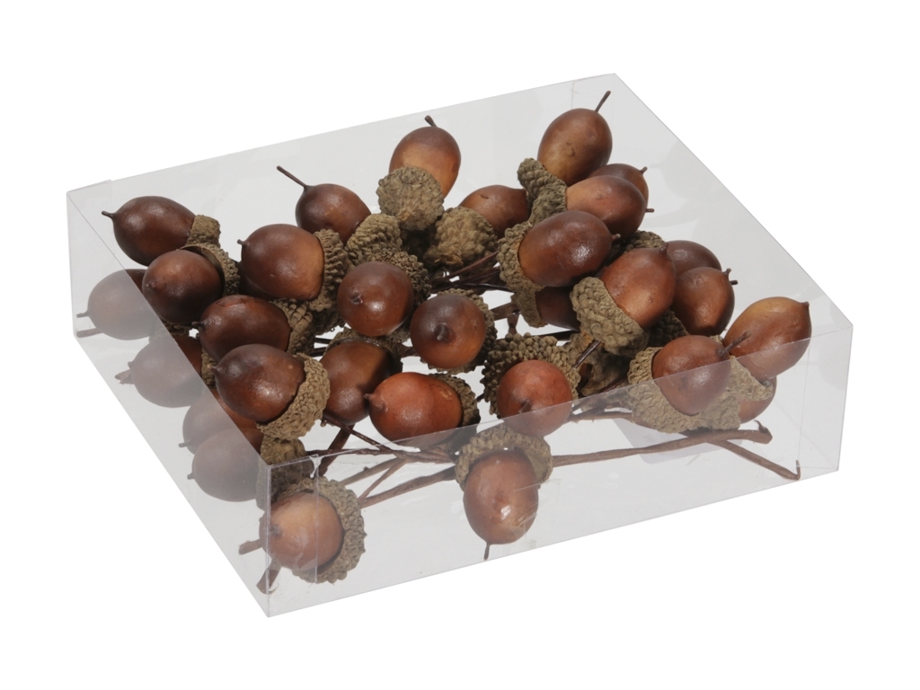 Dekorativní umělé plody - žaludy. V sadě je 36 ks žaludů. Žaludy jsou po 3 ks ve svazku, tzn. 12 svazků po 3 žaludech.Materiál: polystyren, dřevěný klobouček, drátRozměry:výška 3,5 cm prečítať celé