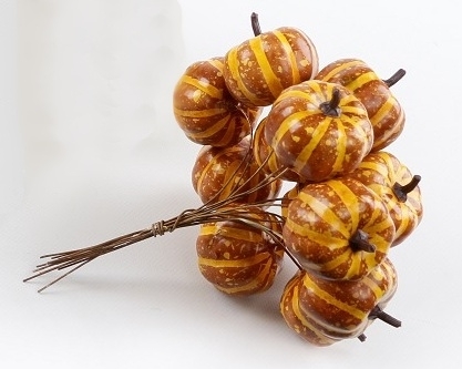 Svazek 12 ks dekorativních polystyrénových dýní na drátku. Vypadají téměř jako pravé dýně ze zahrádky. Jejich výhodou je, že je můžete bez obav použít i v dalším roce. Dýně jsou krásné v podzimních aranžmá v truhlících, květináčích, věncích i kyticích.