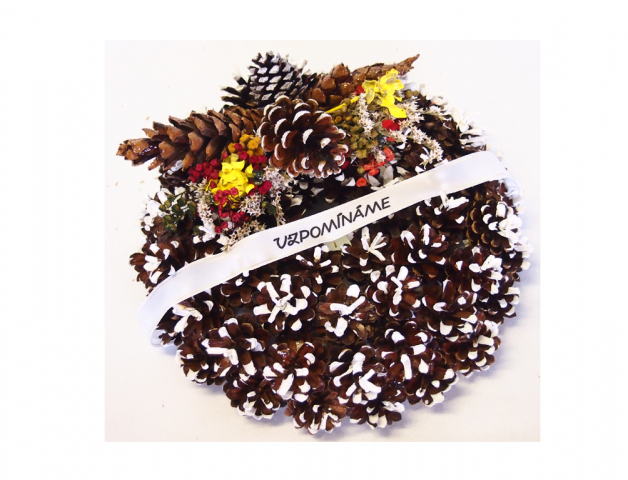 Hřbitovní věnec zejména z přírodních materiálů. Na korpus o průměru 20cm jsou po celé ploše připevněny borové šišky s bíle obarvenými konci. V těžišti věnce se vyjímá plně vyvážené aranžmá ze smrkových šišek, žlutě obarvených světlic barvířských s červeně obarvenými jemnými kvítky doplněnými dalšími přírodními prvky.