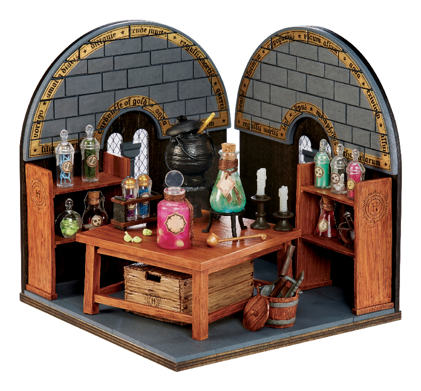 Minihračky – kouzelnická dílna Harry Potter. Do kouzelnické dílny si můžeš ukládat všechny vyrobené lektvary a kouzla. Vyrobíš je z ingrediencí, které jsou v balení, pak vše necháš alespoň 5 minut na přímém slunci vytvrdnout nebo na ně zasvítíš UV lampičkou. Podlahu si sestav z dlaždic, každá má své číslo, použiješ cement a můžeš si zahrát na zedníka či obkladače.