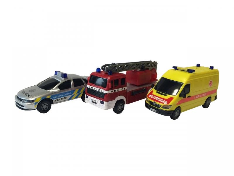 Set 3 ks dopravních prostředků - ambulance a hasičké auto na volnoběh a policejní auto na setrvačník. Hasičské auto s funkční stříkačkou na vodu (manuální funkce). prečítať celé