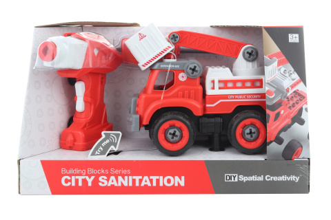 Šroubovací hasičské auto na dálkové ovládání. Auto lze sešroubovat pomocí přiloženého šroubováku nebo vrtačky. Z vrtačky lze vyndat motorek, který se vloží do auta a to poté jezdí pomocí ovládání dopředu a dozadu. Auto také vydává zvuky. Napájení na 4 AA baterie (nejsou součástí) a na 3 AG13...