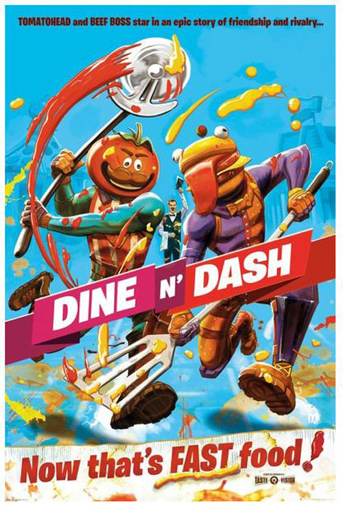 Oficiální plakát z katalogu produktů s logem a grafikou videohry Dine' N Dash.