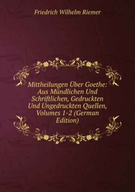 This book, Mittheilungen Uber Goethe: Aus Mundlichen Und Schriftlichen, Gedruckten Und Ungedruckten Quellen, Volumes 1-2 (German Edition), by Friedrich Wilhelm Riemer, is a replication. It has been restored by human beings, page by page, so that you may enjoy it in a form as close to the original as possible. This book was created using print-on-demand technology. Thank you for supporting classic literature.