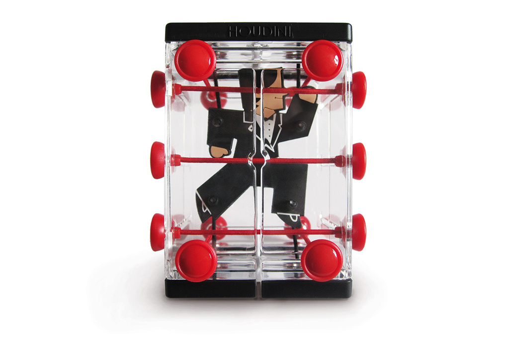 Vysvoboďte Houdiniho zamotaného do provazů. Nejdříve zauzlujte barevné provázky různým přesouvání po obvodu klece. Nyní je Vaším úkolem provázky rozmotat zpět tak, že jsou nezamotané, rovné a Houdini je volný, žádný z nich se ho nedotýká. Ideální hlavolam na dovolenou a na cesty! Doporučený věk: 7+