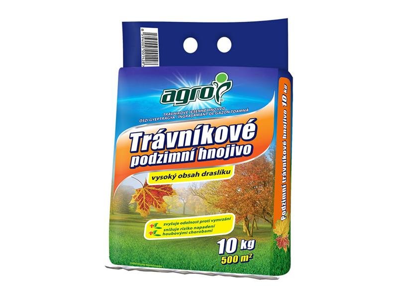 AGRO Podzimní trávníkové hnojivo podporuje lepší vyzrávání trávníku před zimou, zvyšuje odolnost proti vymrzání a vůči suchu, snižuje riziko napadení houbovými chorobami, udržuje travní porost kompaktní a odolnější vůči sešlapu. Obsahuje vysoký podíl hořčíku pro sytě zelenou barvu trávníku a vysoký podíl síry nezbytné pro růst a zdravý vzhled trávníku.