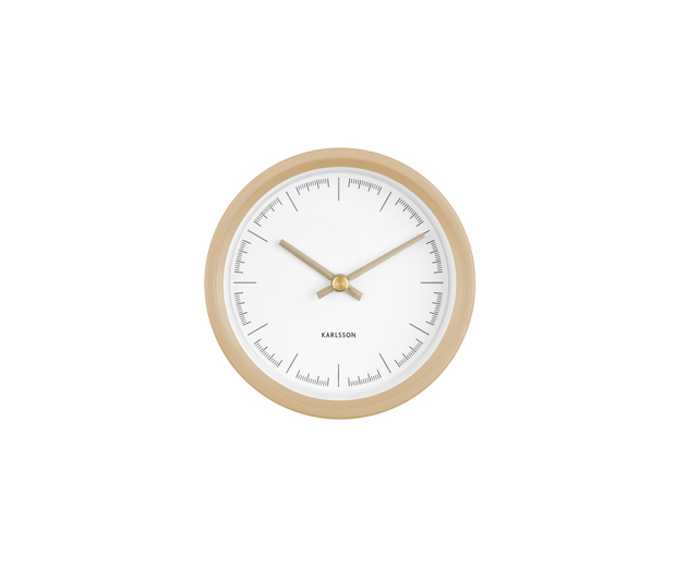 Nástěnné hodiny v pískově hnědé barvě s bílym ciferníkem.
