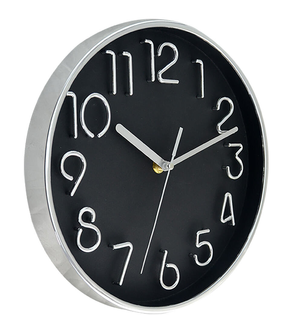 Elegantná kombinácia strieborného rámu a čierneho podkladu s 3D ciferníkom zaisťuje výbornú čitateľnosť aj z väčšej vzdialenosti. Hodiny majú priemer 30,5 cm a vďaka kvalitnému prevedeniu z plastu, kovu a skla pôsobia moderne a odolne. Univerzálne farebné prevedenie striebornej a čiernej bude pasovať do väčšiny interiérov, či už chcete doplniť obývačku, kanceláriu alebo kuchyňu.