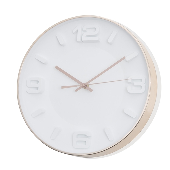 Nástěnné hodiny v bílé barvě ze skla a plastu. Okraje jsou měděné barvy.