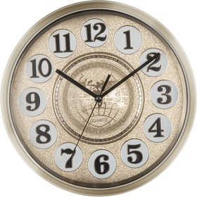 Nástěnné hodinyNapájení z baterieRozměry 250 MMPouzdro ve tvaru kruhuPlastové pouzdroZlatavá barva pouzdraRučičkový ciferníkZlatavá barva ciferníkuCiferník s arabskými čísly prečítať celé