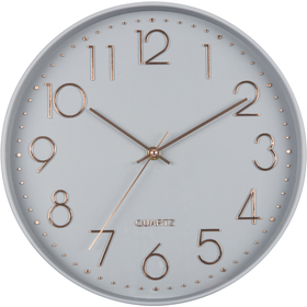 Nástěnné hodinyNapájení z baterieRozměry 290 MMPouzdro ve tvaru kruhuPlastové pouzdroŠedá barva pouzdraRučičkový ciferníkŠedá barva ciferníkuCiferník s arabskými čísly prečítať celé
