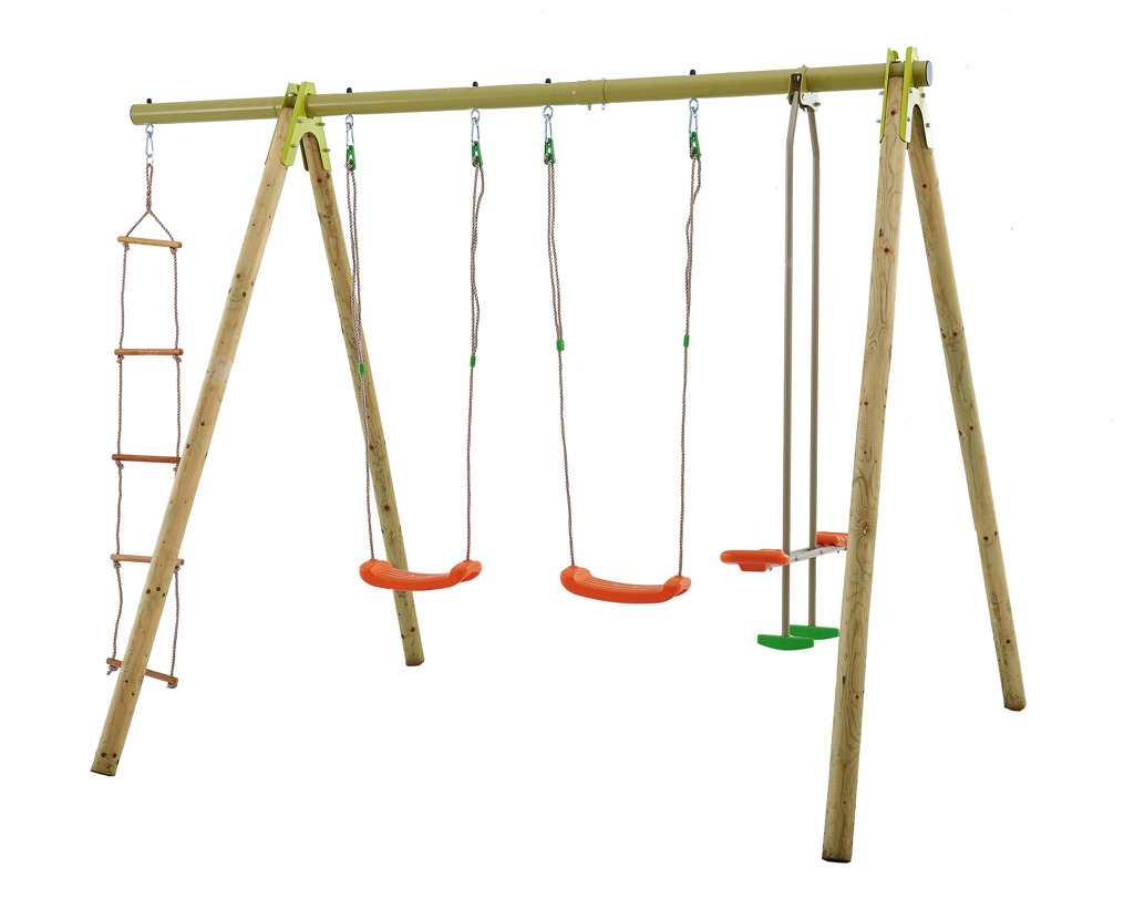 Dřevěná sestava vysoká 230cm s vrchní kovovou tyčí,2 plastová sedátka a houpací sáně s provazovým žebříkem,doporučená maximální váha na houpací sedátko je 50kg a maximální váha na houpací sáně je 50kg na dítě na každé straně. prečítať celé