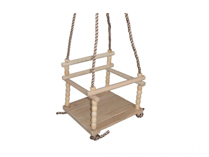 Houpačka dřevěná (dětská). Rozměry sedáku 30 cm na šířku a29,5 cm na délku. Výška opěrátka od sedáku je 26 cm. Délka provazu, jeod sedáku, po místo zavěšení kroužku – 140 cm. Nosnost do 40 kg.Výrobek není vhodný pro děti do 3 let. prečítať celé