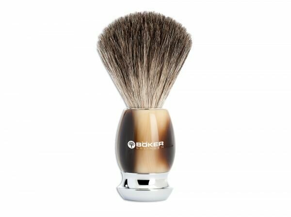 Štetka na holenie Böker Manufaktur Classic Horn vyrobená zo spracovaného prírodného materiálu. Vlákno materiálu sa mení z bielej na hnedú až tmavohnedú. Ďalšou charakteristikou je tzv. Zrkadlo - pravidelná čierna páska, ktorá prechádza inak striebornými vlasmi. Štetec je vyrobený ručne.