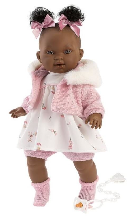 Mluvící panenka s měkkým látkovým tělem a s vlásky po celé hlavě. Po vytažení dudlíku z úst začne panenka říkat „mama“, „papa“ a vydávat reálný zvuk plačícího miminka. Panenku lze utišit dudlíkem. Součástí balení je 3× knoflíková baterie LR44. Velikost 38 cm. prečítať celé