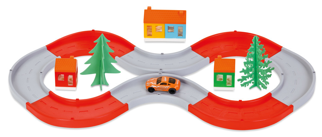 Silnice-autodráha menší o rozměrech 61 × 31 cm. Součástí balení autíčko na baterii, 3 domečky, stromky. prečítať celé
