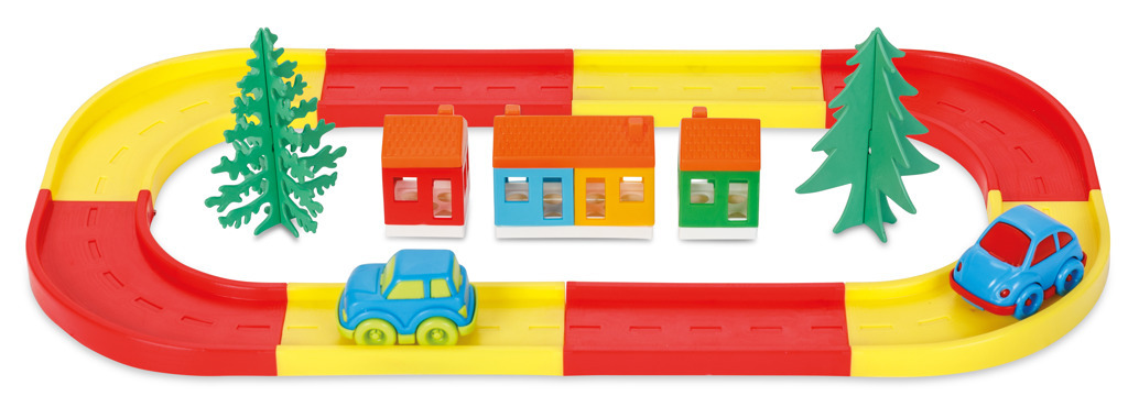 Silnice-autodráha OVÁLNÁ, pravidelný tvar.3 domečky, stromky a součástí balení jsou i 2 autíčka. Rozměry 56 × 57 cm. prečítať celé