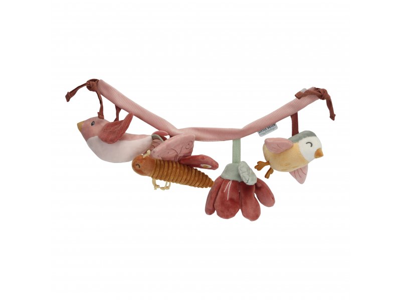 Čtyři zavěšené plyšové hračky v podobě květiny, motýla a dvou ptáčků zabaví vaše miminko na cestách v autosedačce či kočárku. Jednotlivé hračky při zkoumání dětskými ručičkami chrastí, po zmáčknutí pískají a šustí, pozornost dítěte upoutá i bezpečné zrcátko. Hračky stimulují koordinaci ruka / oko dítěte.