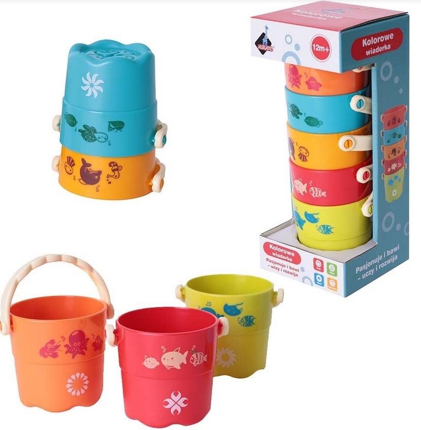 Zestaw 5 wiaderek z uchwytami do zabawy i kąpieliWiaderka -kubeczki można włożyć jedno w drugie, lub zbudować wieże- co rozwija u maluchów sprawność manualną i koordynację ruchową. Dodatkowo napełnianie ich i opróżnianie, jest fajną zabawą podczas kąpieli oswaja malucha z wodą. Dna wiaderek mają...