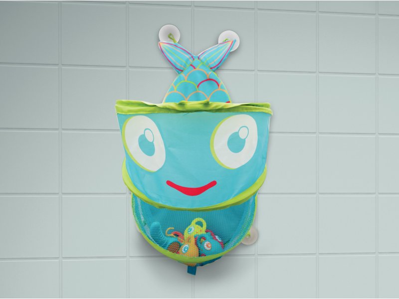 Originální skládací koš na hračky v podobě usměvavé ryby snadno připevníte díky čtyřem přísavkám nad vanu. Síťovinové díly umožňují odtok vody z uložených hraček a jejich vyschnutí.