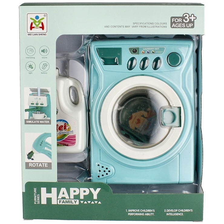 Pračka má zvukové a světelné efekty, buben pračky se při zapnutí otáčí, má výsuvnou zásuvku na prací prášek, po umytí ji lze vytáhnout ze středu, pračku v bílé mátové barvě. Obsah soupravy: funkční pračka, imitace tekuté láhve. Výrobek z plastu. Rozměry jsou 10x14x8 cm. prečítať celé