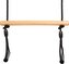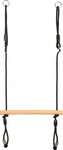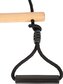 W produkcji trapezowej huśtawki z kołami gimnastycznymi wykorzystano metal oraz prawdziwe drewno.
