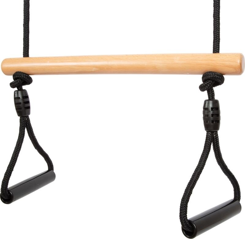 Huśtawka gimnastyczna Black Line Small Foot to rozwiązania 2 w 1: trapezowa huśtawka z drążkiem łączy się z kołami gimnastycznymi jak na prawdziwym placu zabaw.