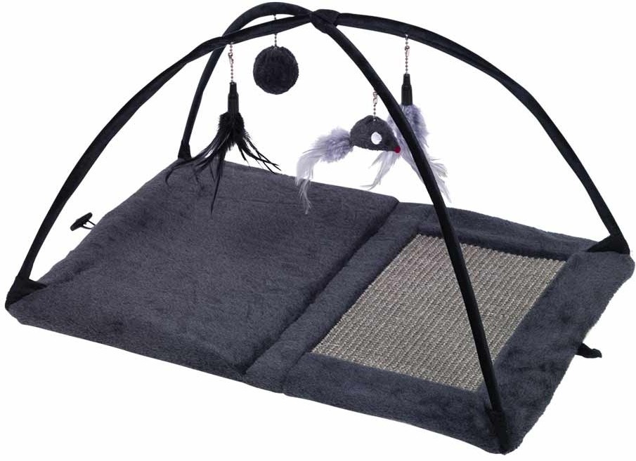 Kočičí hřiště s obloukovou konstrukcí, na níž jsou zavěšeny čtyři hračky s peříčky, chrastítky a rolničkami. Základová deska hřiště potažená jemným plyšem je skládací, jedna polovina slouží jako masánží zóna a nabízí intenzivní zážitek z drbání srsti. Hrací kulička zavěšená na konstrukci je...