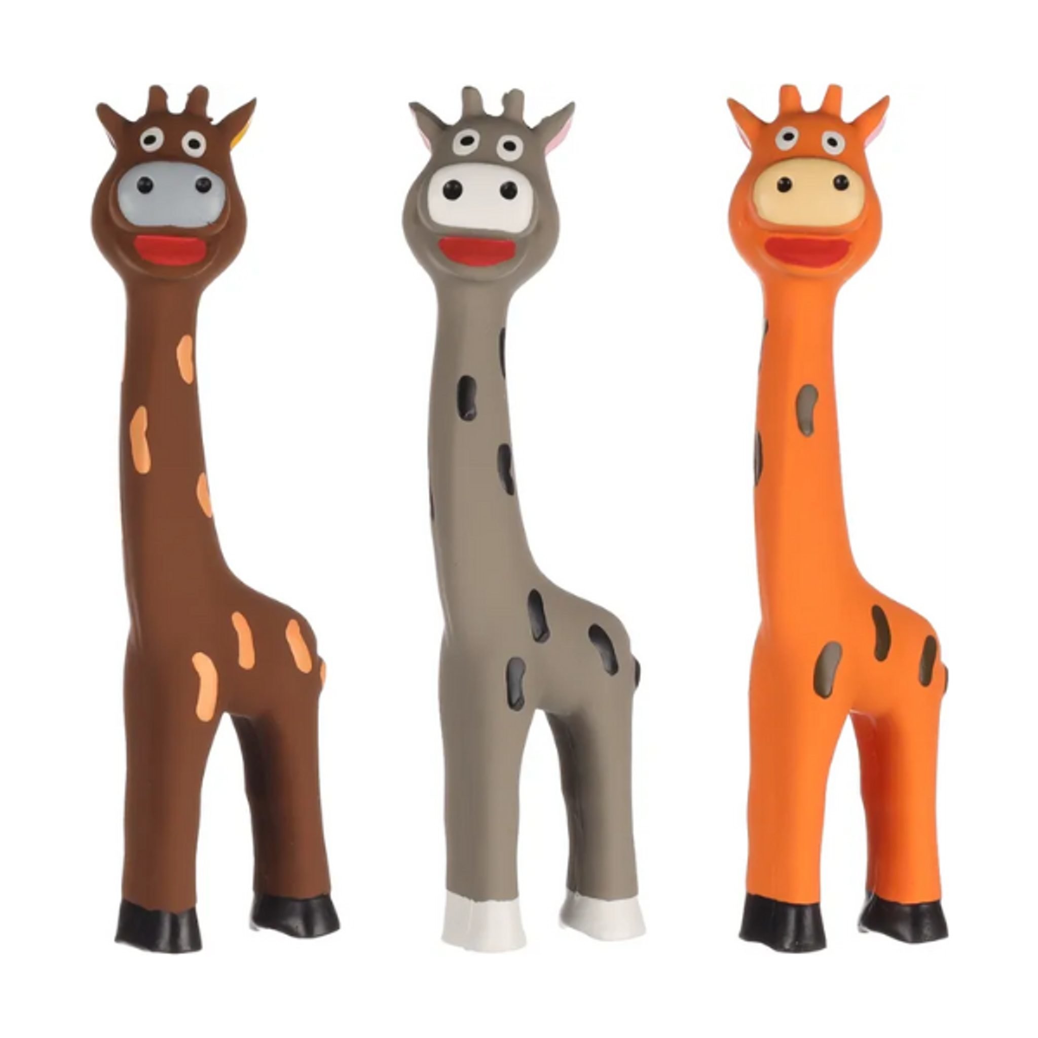 Měkká a pružná latexová hračka pro psy ve tvaru žirafy s dlouhým krkem, která lze snadno uchopit a stisknout v tlamě. Pískátko zabudované v hračce povzbuzuje vašeho psa ke hře a přinese extra zábavu navíc. Hračka je vyrobena z odolného latexu přesto je měkká a šetrná k zubům psa.
