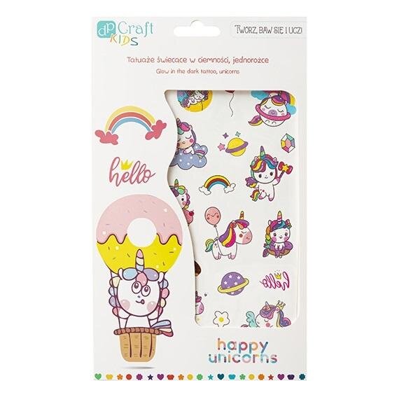 Świecące w Ciemności Tatuaże - Wzór JednorożceDodaj odrobinę magicznego blasku do zabawy dzięki naszym świecącym w ciemności tatuażom z wzorem jednorożców najpopularniejszego, dziecięcego motywu! Ten zestaw zmywalnych tatuaży to idealny sposób na wprowadzenie ekscytujących i kreatywnych akcentów...
